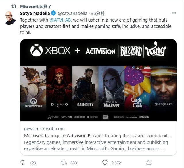 据报道,微软宣布收购视频游戏公司动视暴雪,微软CEO还转推了这条新闻。