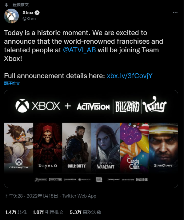 - 2022-01-19 微软687亿美元收购动视暴雪:钞能