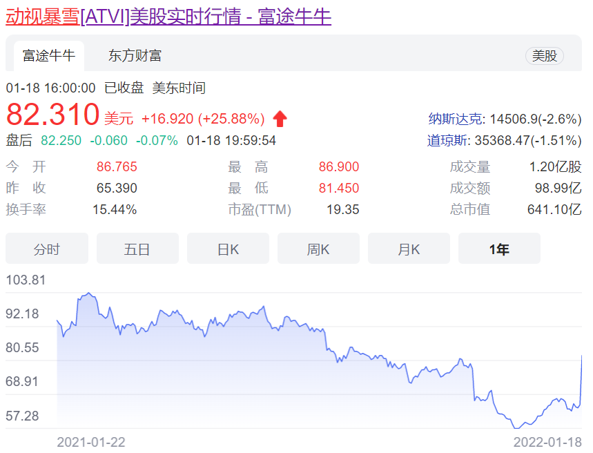 动视暴雪股价在经历一年下跌的情况下跳涨
