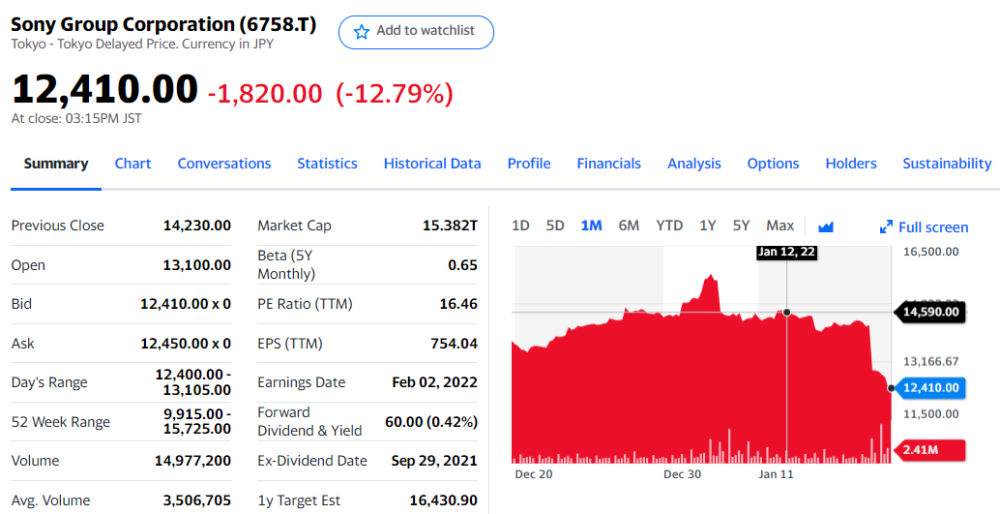 在微软以687亿美元全现金收购动视暴雪消息传出后,索尼东京股价周三经历暴跌,全天收跌12.79%,单日市值蒸发超200亿美元。股价从21年的高点回落,重回2021年10月的水平。