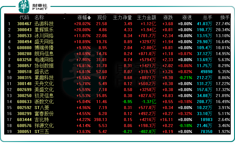 1月19日,A股云游戏、网络游戏、电子竞技、手机游戏等游戏板块强势崛起,概念股集体翻红。具体看,迅游科技、星辉娱乐收获20cm涨停,冰川网络大涨11%,盛天网络、博瑞传播涨停,电魂网络、美盛文化、吉比特等纷纷跟涨。