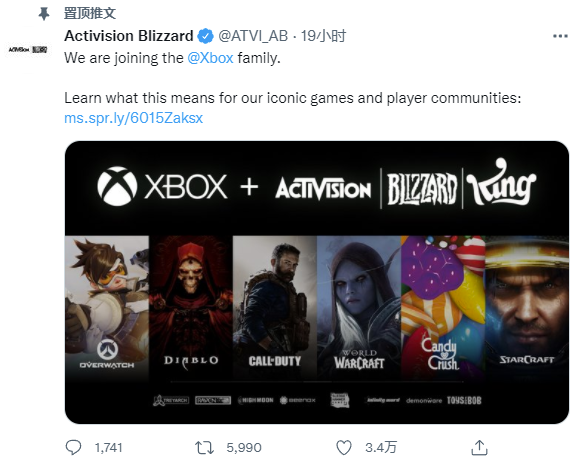 动视暴雪的官方推特也在置顶推文上证实了这一消息,并且配了一张动视暴雪全家桶加入 Xbox 的图。