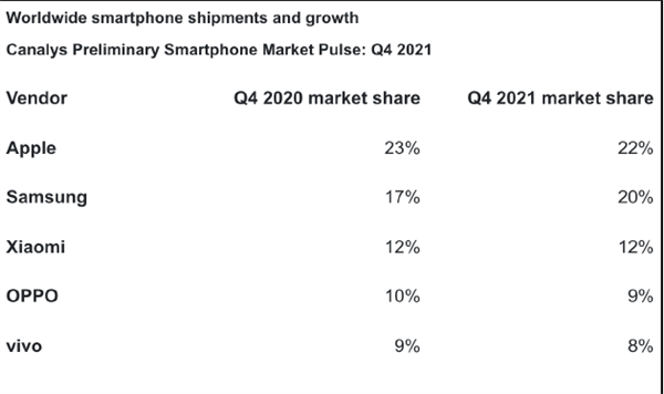 数据研究机构Canalys发布的最新报告显示,苹果手机在2021年第四季度占全球智能手机出货量的22%,坐上全球智能手机市场的头把交椅,三星以20%的市场份额紧随其后。