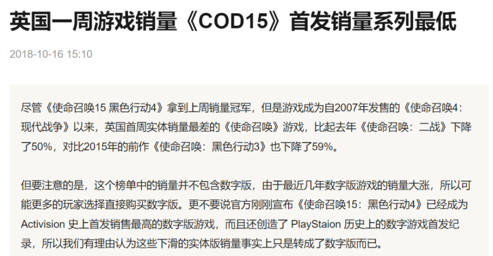 COD15和16销量不行,当时其实已经有些苗头:比如英国COD15销量就是系列最低,虽然新闻中提到数字版销量系列最高,但随着数字平台的发展成熟,这个销量肯定是持续走高的,而“没带就是没写”,没报具体数字只能说明这个数字不值得公开。
