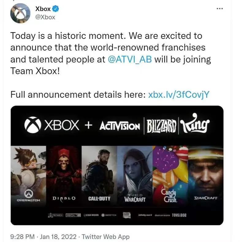 - 2022-01-20 微软 687 亿美元巨资收购动视暴雪,