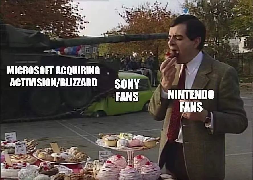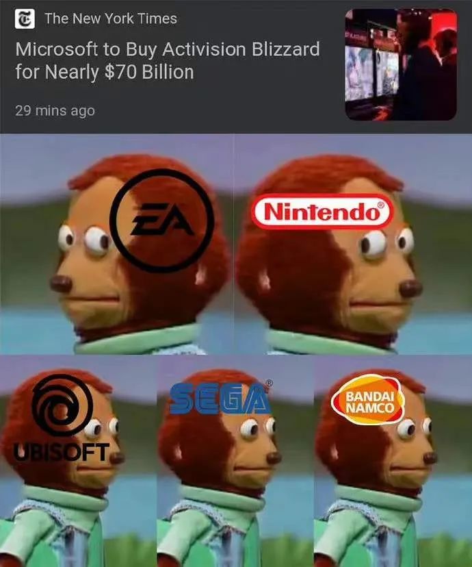毕竟,你可能猜不到微软会在什么时候收购暴雪,但所有人都知道,消息出来后就全是梗图了(图片来自万能脑洞的网友萌~)