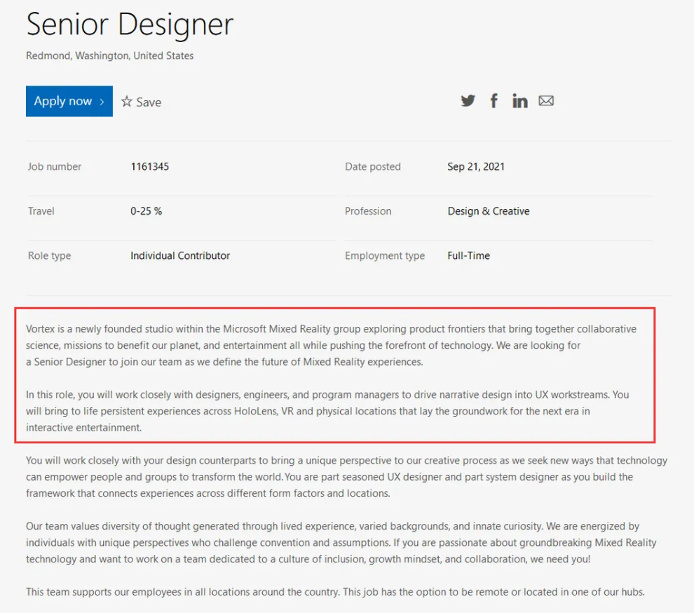 “Vortex 是 Microsoft Mixed Reality 集团内新成立的工作室,探索产品前沿,将合作科学、造福地球的任务和娱乐结合起来,同时推动技术的前沿发展。我们正在寻找一位高级设计师加入我们的团队,因为我们正在定义混合现实体验的未来。”