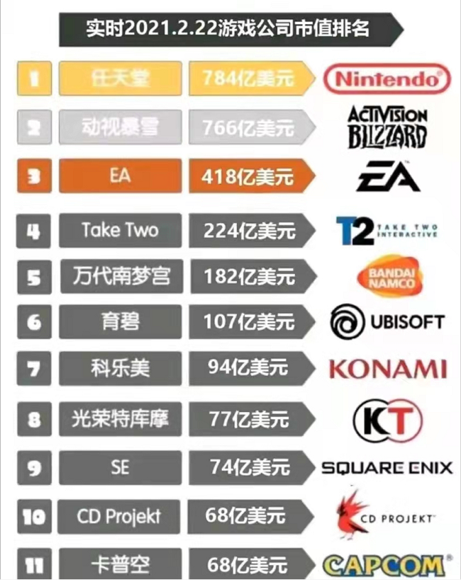 687亿美元,说是一掷千金也不为过了吧。根据2021年知名游戏厂商市值排名,卡普空68亿、育碧107亿、万代182亿、EA 418亿,也就是说微软能在一晚让这些大厂改名换姓,变成它的形状。