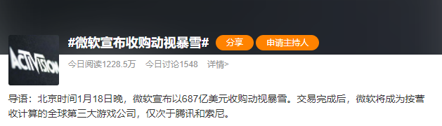 2022年1月19日,微软公司对外宣布将动视暴雪收入麾下,消息一经公布便震惊全球互联网,具体有多震惊,连国内官媒都来专门报道这件事。