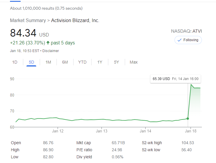 而动视暴雪在被收购之后,股价也迎来了久违的上涨,从掉到低点的57美元变成了87美元,涨幅一度达到了36%,这是动视暴雪最近一年来最大幅度的反弹,可见其意义之大。