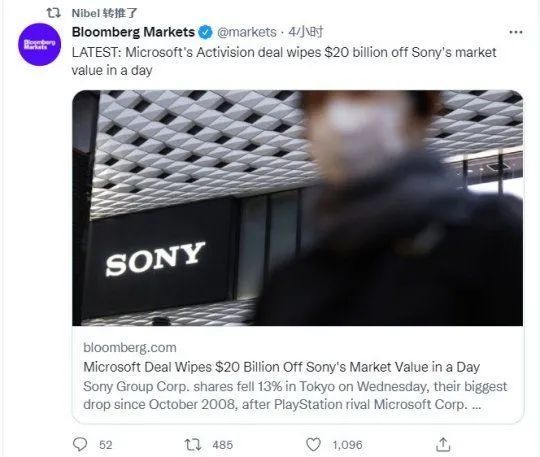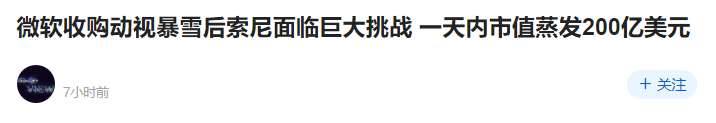 微软这边实力涨一涨,索尼那边便股价跌一跌,收购消息公布的当天,索尼股价暴跌13%,市值一天之内蒸发约200亿美元。