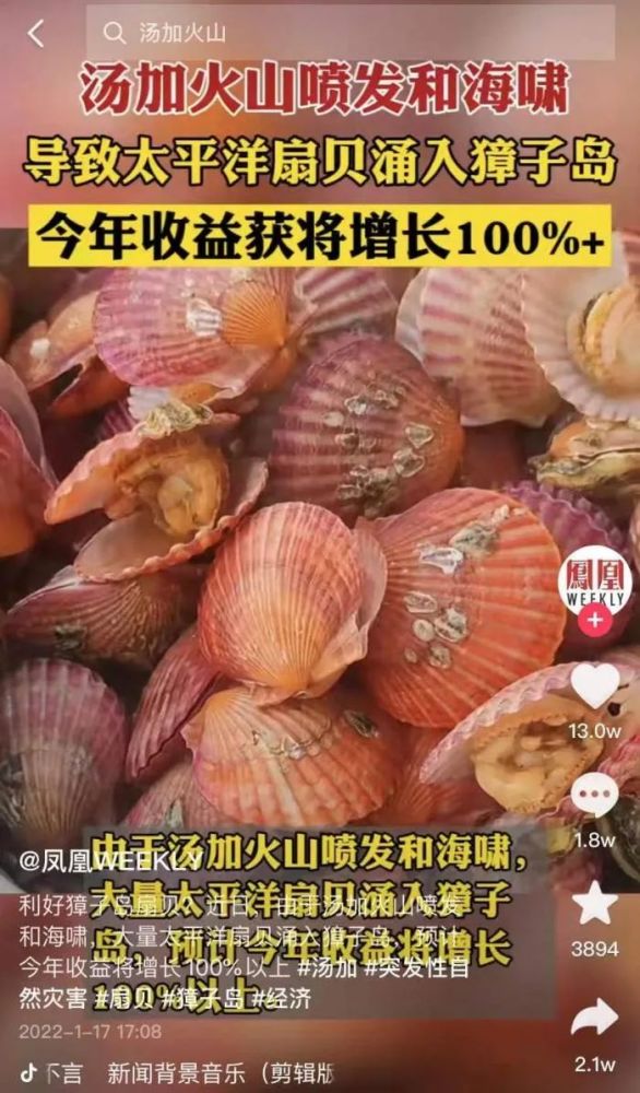 ( 快科技 )昨天《 凤凰周刊 》抖音官方账号发布一则短视频,并配文称 “ 由于汤加火山喷发和海啸,大量太平洋扇贝涌入獐子岛,预计今年收益将增长 100% 以上。”