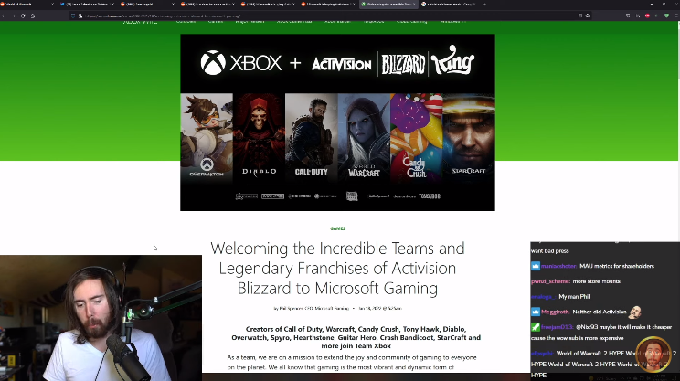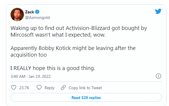 在1月18日的一条推文中,Asmongold透露他刚得知了消息,像多数玩家一样,收到消息的时候一脸懵逼,不过他希望这次收购能够使游戏社区向前发展。