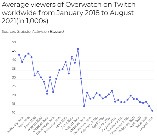除了人员变动和企业文化,动视暴雪做游戏,可以说,已经没有情怀了。以下数据可以从侧面进行说明,其月活跃用户数下降和用户对于暴雪游戏的认可度降低已成不争事实。用户峰值打到4600万已是2017年Q2的事情,那是在《守望先锋》和《魔兽世界》“燃烧的远征”发布一年后。近四年,真的只能用平稳下滑来形容暴雪的“退步”,除了疫情开端为动视暴雪带来的一些增长。