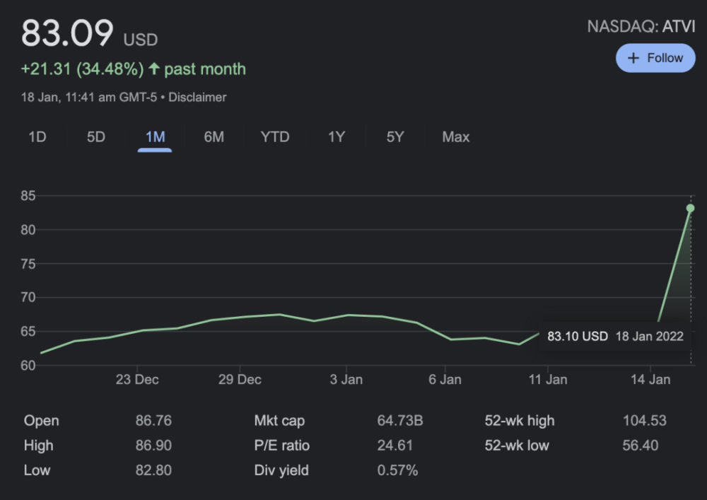 其他无法短期得出定论,但肯定的是,无论是微软游戏的粉丝,还是动视暴雪的粉丝,都对这场交易进行了投票。这也是为何消息传出后,动视暴雪盘前大涨37%。