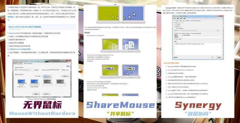 其中Synergy我用得最早,Win7时期我就玩过,不过当时的软件稳定性不佳,不久放弃改用ShareMouse,最后一直在用MouseWithoutBoarder(无界鼠标),三者功能相似,都可以提高办公、读屏效率,“以1胜2”。