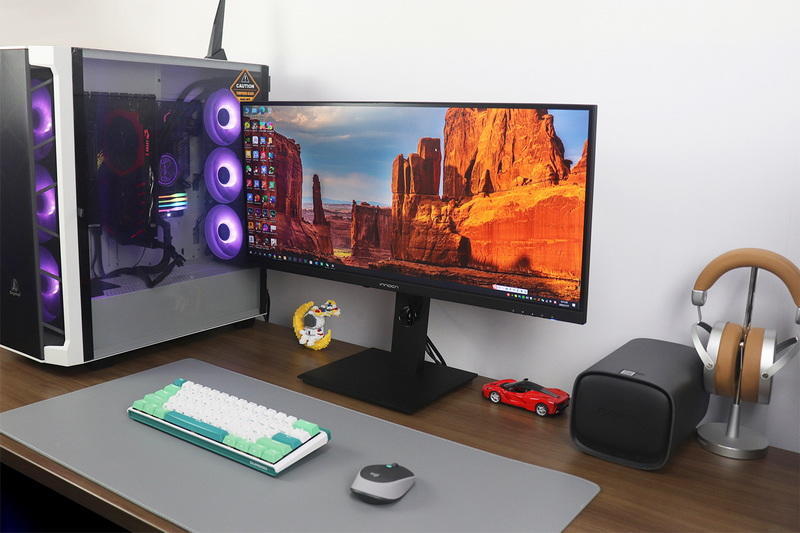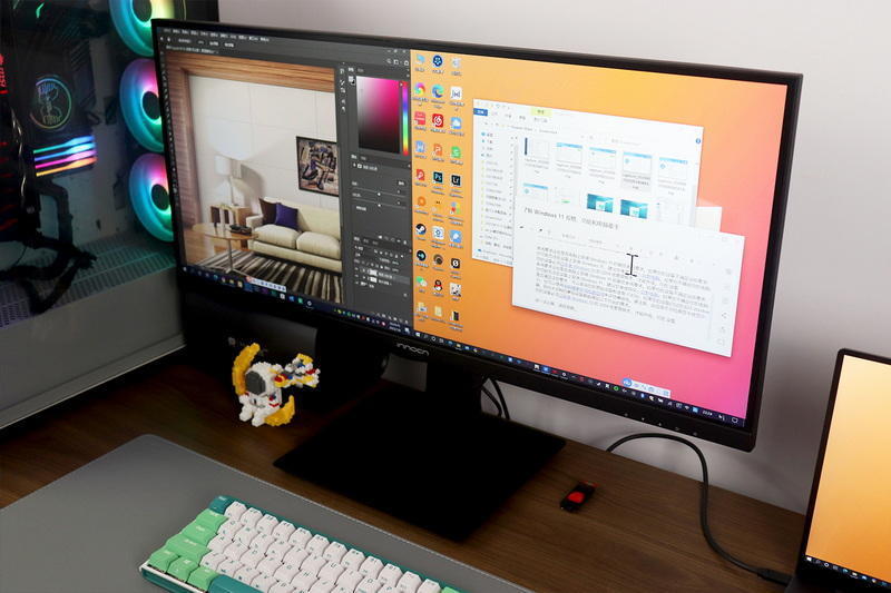 2,如果选择显示器,那么钱就要用到刀刃上(能不动用资金更好),显然,21:9比例的超宽带鱼屏依然是最优解。因为普通宽屏大多不支持分屏;即使支持分屏,1:1对半分之后,左右两区也因为太窄而显得鸡肋。换成带鱼屏,就宽裕许多,而且还可以酌情选择2:1、1:2,画中画(PIP)等方式花式分屏。