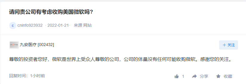 大牛股九安医疗(002432)1月24日早间在深交所互动平台互动易上,回答投资者提出的是否考虑收购美国微软的问题时表示,微软是世界上受众人尊敬的公司,公司的体量没有任何可能收购微软。
