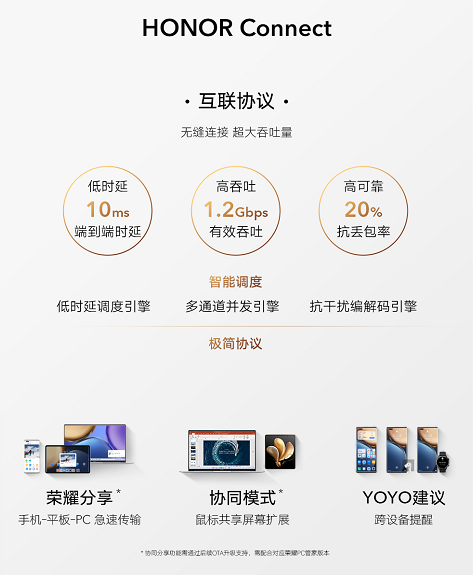 通过Magic Live智慧引擎与跨设备OS深度结合,Magic UI 6.0,在不同系统、不同生态之间搭建了一座桥梁。全新的HONOR Connect互联协议,将协议开放货架化,支持兼容 OLA协议和 Matter协议,可以与更广泛的第三方生态设备协同。并且HONOR Connect拥有强大互联的能力,具备低延迟(10ms)、高吞吐(1.2Gbps)、高可靠(抗丢包率低于20%)三大特点,可以让用户无缝体验互联的畅快。