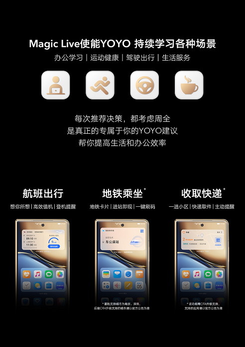 例如在商旅出行场景中,YOYO建议会及时显示航程信息,语音催促登机,一键打开登机牌;地铁场景中,用户靠近地铁站闸机附近时,Magic UI 6.0可自动弹出乘车卡片,让用户乘车快人一步;在快递场景中,当用户处在小区范围时,Magic UI 6.0会提醒用户去快递柜取件……