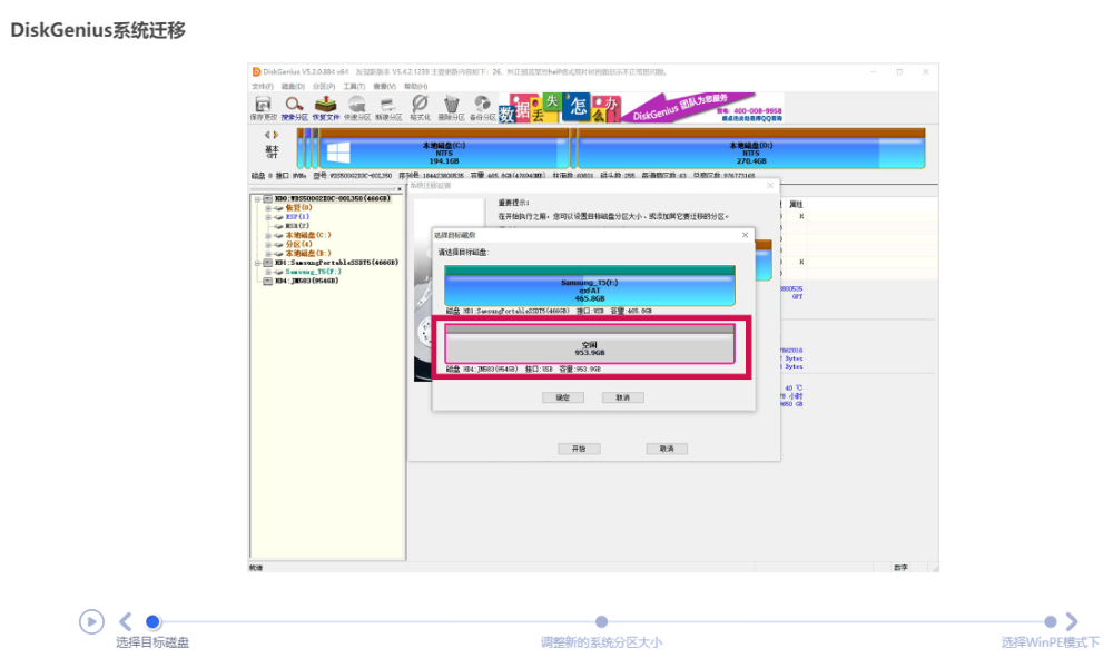 从DiskGenius官网下载好软件后,打开在主界面先确认你的新盘已经接上电脑,然后在菜单栏的“工具”找到系统迁移,在弹出的窗口会先让你选择目标磁盘,也就是选择新的SSD,然后可以调整在新的SSD上,给到多少空间给系统盘,因为默认是保持现在系统的大小,所以这里注意就只需改变“系统分区大小”,比如原来的系统盘是200GB,那么新盘就可以拉大到400GB,甚至整个新盘的大小。