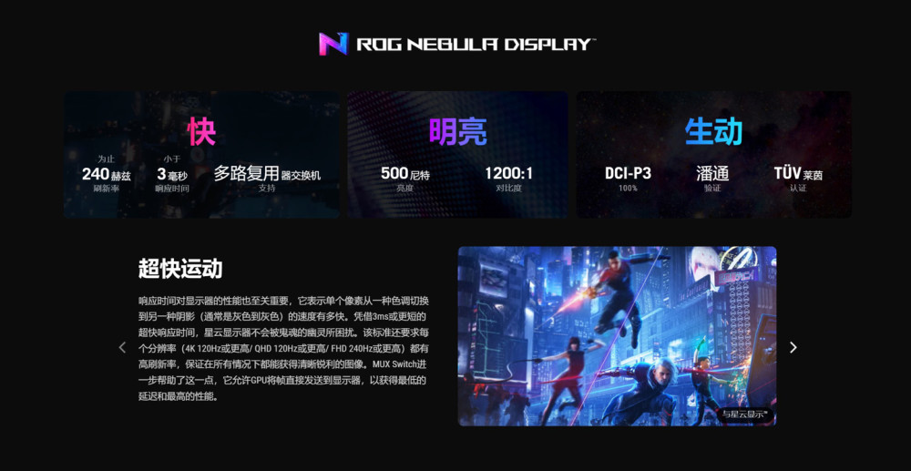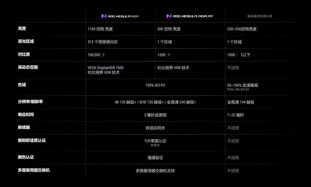 此次 ROG 全系列支持双显三模技术,即在电源模式下可自由选择核显直连、混合输出以及独显直连三种模式。屏幕也迎来了星云屏,我这里将官方的星云屏参数标准贴出来,大家自行暂停了解下。