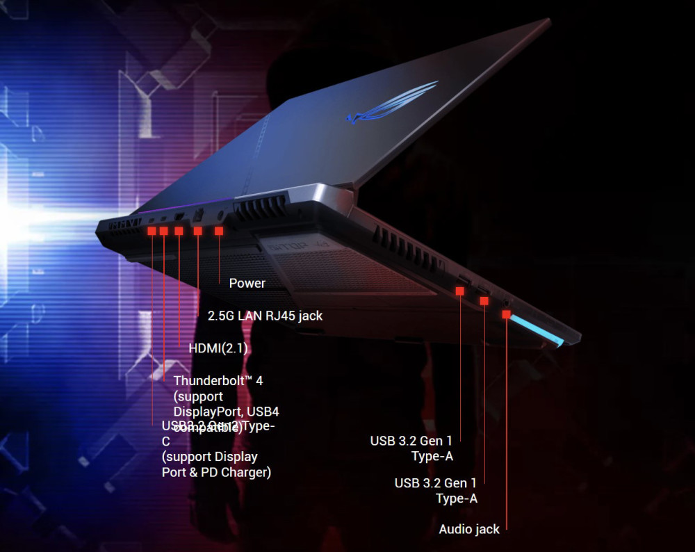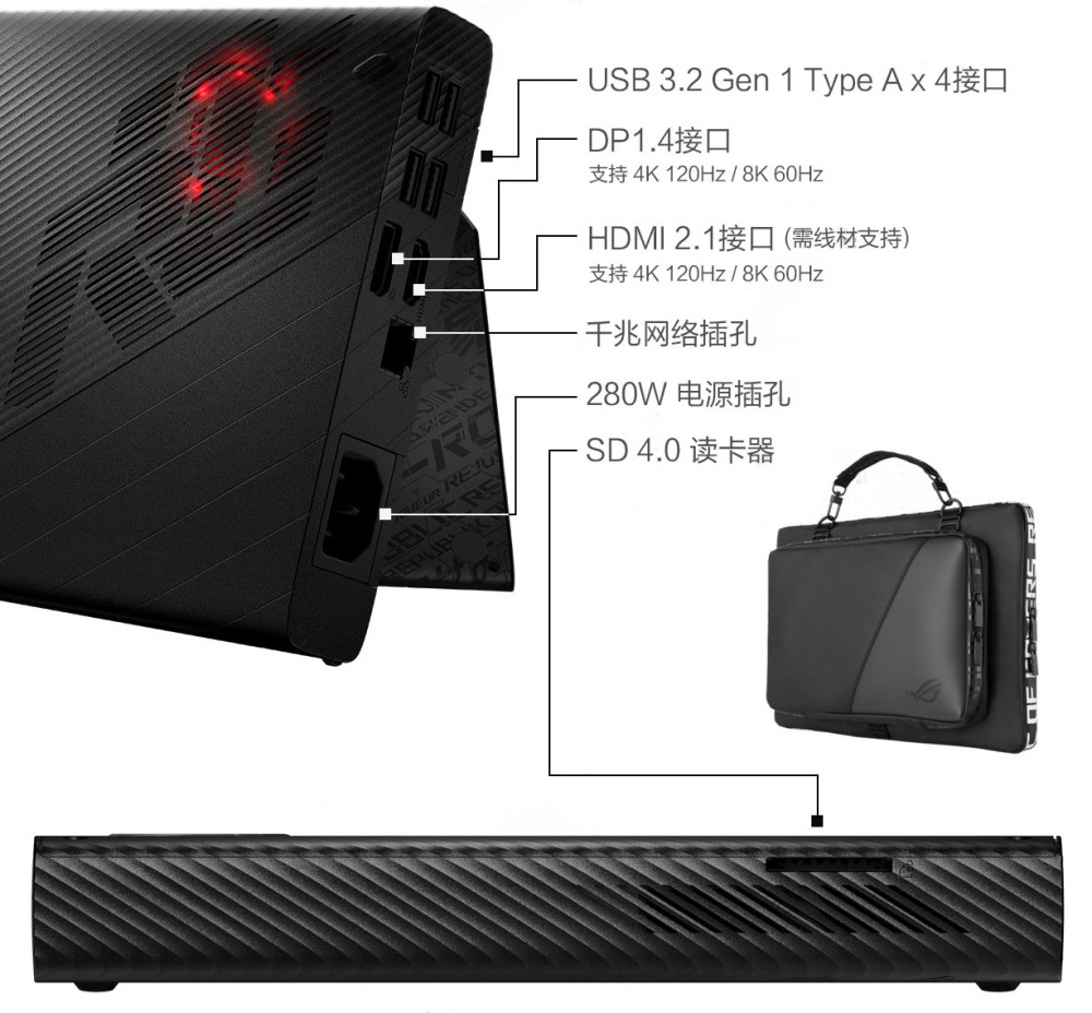CPU 方面最高可选 i9-12900H,拥有液金散热技术,GPU 最高可选 RTX3080Ti,存储方面标配 32GB DDR5 5200MHz 内存 + 2TB PCIe4.0 M.2 SSD,接口方面提供了 2 个 USB3.2 Gen2 Type-A 口,2 个支持雷电 4 和 DP 协议的 USB-C 口、一个 HDMI2.1 口,2.5G 网口,3.5MM 耳机孔以及 MicroSD 7.0 卡槽。