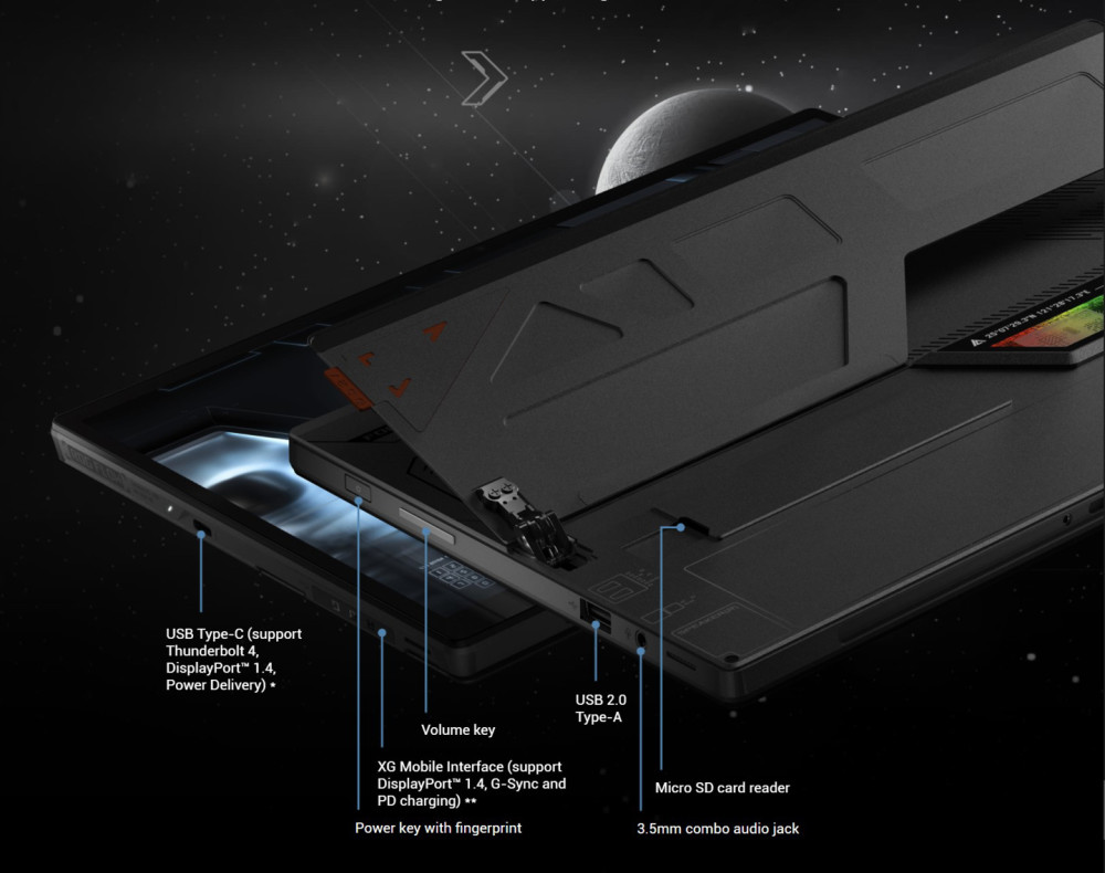 支持 Wi-Fi 6E 和蓝牙 5.2,配套磁吸键盘支持 RGB 灯效,IO 接口有 1 个 USB 2.0 Type-A、1 个全功能 USB 3.2 Gen 2 Type-C、1 个雷电 4 Type-C、MicroSD 卡槽,3.5mm 耳机孔以及 XG Mobile 专有接口,接口数量和扩展性比较不错。