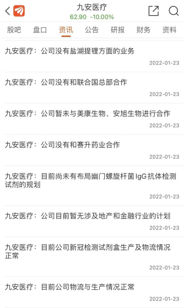 不过目前,九安医疗在上周五缩量跌停后,今早继续跌停。截至1约24日收盘,九安医疗报62.9元/股。至此,公司最新股价距离高点88.88元已下跌近30%。