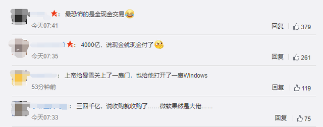 687亿美金的收购案,是有史以来游戏领域最大的案例,交易完成后,微软将成为全球收入第三大游戏公司,仅次于腾讯和索尼。而这则消息宣布后,话题#微软宣布收购动视暴雪#立即冲上微博热搜,有网友在评论区留言感叹:“最恐怖的是全现金交易”“4000亿,说现金就现金付了”“ 三四千亿,说收购就收购了,微软果然是大佬……”。
