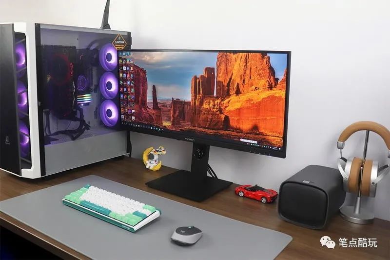刚才说的都是“双屏幕单键鼠”,可如今买房难,小户型小桌面,两台显示器太占桌面,而且不少朋友还是一台PC台式机+一个笔记本的情况居多。这也是我之前说的“上班笔记本、回家台式机”,这个时候,选择一个大尺寸或带鱼屏更合算,平时用台式机大屏,回家用笔记本的时候,外接这块显示器,视野更宽阔。