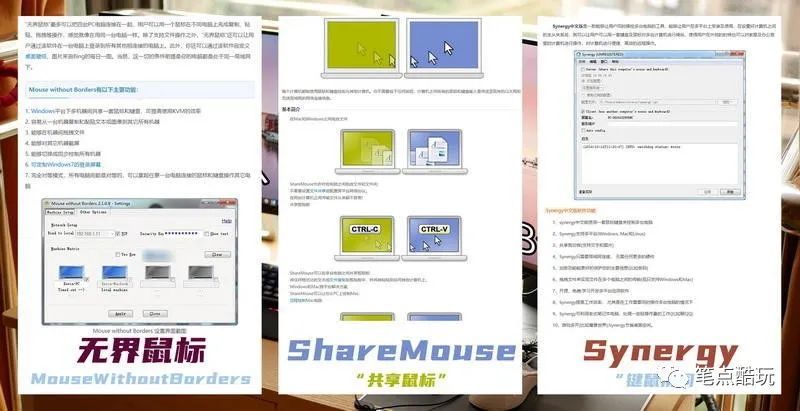 视频中提到的3种共享键鼠软件,MouseWithoutBoarder(无界鼠标)、Synergy(“键鼠协同”)、ShareMouse(“共享鼠标”)我都用过,大家可以自行搜装测试。