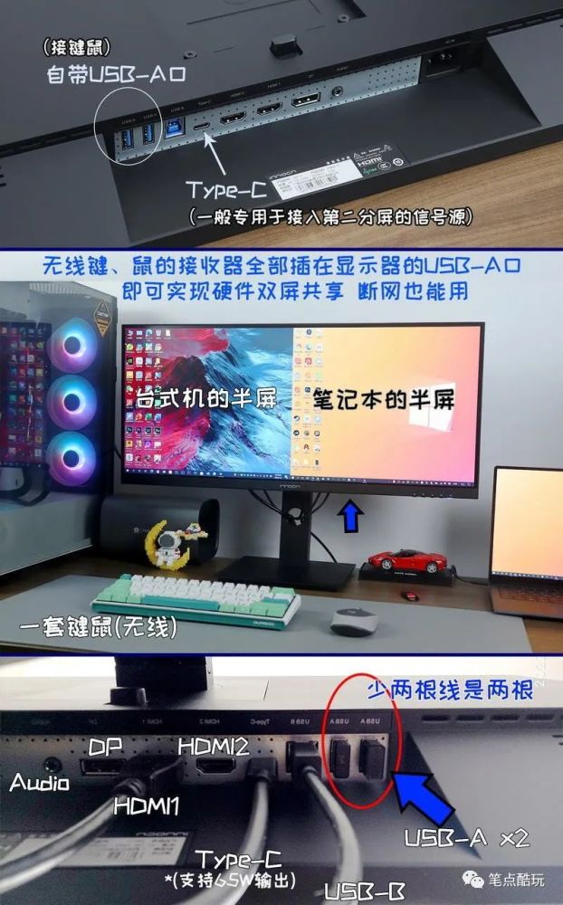 按此方案,带鱼屏双分屏也只露出4根线缆(台式HDMI或DP线,笔记本Type-C线,USB-B线,显示器电源线)。