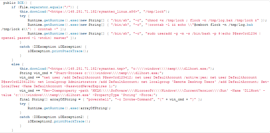恶意 Java 类的部分代码,所有指标与 Microsoft & The DFIR Report 的分析一致,表明攻击者抓住机会将 Windows 和 Linux 的多个攻击阶段组合成一个漏洞: