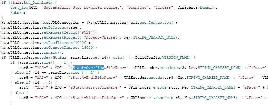 首先,日志功能的实现是相同的。Android 应用使用以下格式将其操作记录到 C&C 服务器:MAC=< DEVICE_NAME >&Log=< LOG >&ModuleName=< MODULE_NAME >&Status=< STATUS >