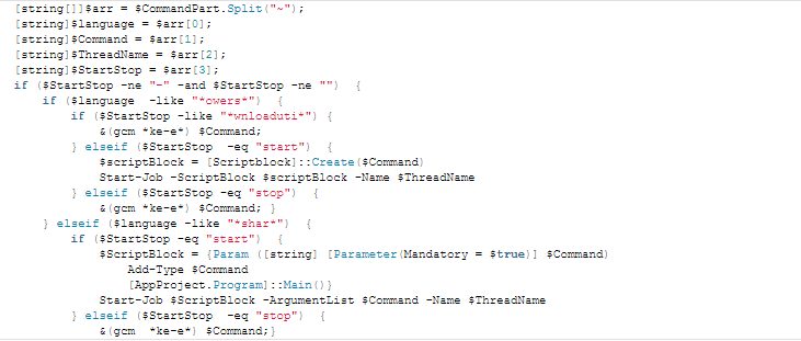 下载的模块要么是PowerShell脚本,要么是c#代码。每个解码的模块有以下格式:language~code~modulename~action,其中的行为可以是stop、start或downloadutil。后者仅与PowerShell模块相关。