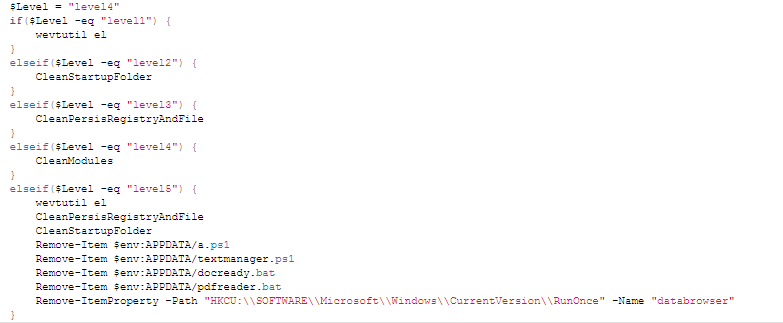 该模块包含五个硬编码级别,具体取决于攻击阶段,每个级别都有不同的用途。执行级别由攻击者在每种特定情况下预先确定: