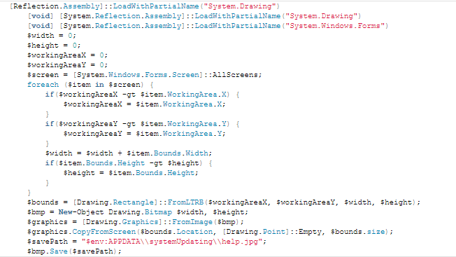 研究人员观察到这个模块的c#和PowerShell变体,每个变体都有能力以指定的频率捕获多个截屏,并将结果的截屏上传到FTP服务器,并在脚本中硬编码凭据: