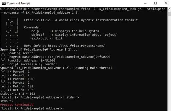 因此,当我们以' 1 '和' 2 '作为参数执行应用程序时,我们期望结果是' 1 + 2 = 3 '。但是,如果我们取消注释第一行(args[0] = ptr(' 100 ');)在函数执行之前,我们将变量op1的值替换为100,得到的结果为' 1 + 2 = 102 '。另一方面,如果取消注释第二行(retval.replace(' 3210 ')) ,我们会在函数 Add 执行之后但在返回结果之前替换返回值,得到 '1 + 2 = 3210'。