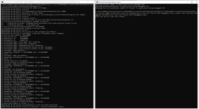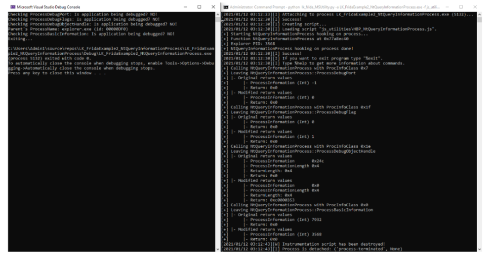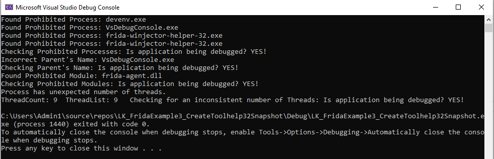 在第一个控制台中,我们看到当我们从Visual Studio执行应用程序时,应用程序如何指示它正在被调试。但是,如果应用程序是直接从终端执行的,则表明它没有被调试。检查这个事实的另一种方法是从像 x64dbg 这样的调试器中执行它。唯一用来做决定的是函数 IsDebuggerPresent 返回的值,因此,我们应该用 Frida 开发一个脚本,拦截这个调用并修改返回值,总是返回 False (0x0)。下面的脚本是为了完成所有这些而开发的: