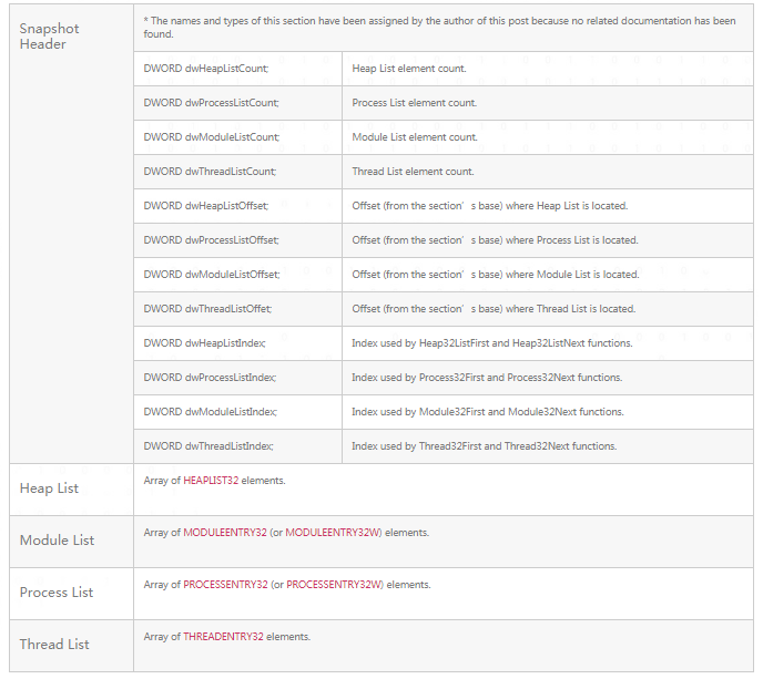 函数 CreateToolhelp32Snapshot 返回一个 SECTION 类型的 HANDLE。如果我们分析 HANDLE 指向的内存部分,我们可以找到一个未记录的结构,其中包含以下部分: