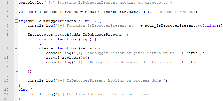 首先,它使用 Module.findExportByName(第 3 行)定位函数“IsDebuggerPresent”的地址。
