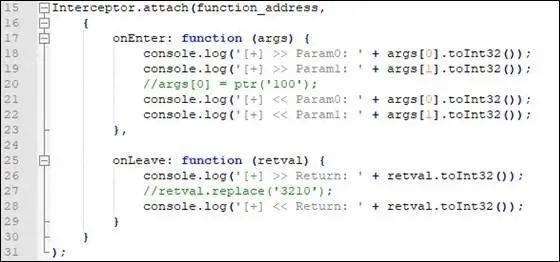 然后,它必须使用 Interceptor.attach(...) 拦截函数调用。