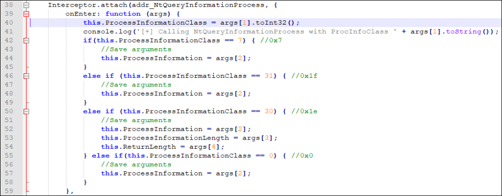每次调用函数“NtQueryInformationProcess”(OnEnter)时,脚本必须执行以下操作:
