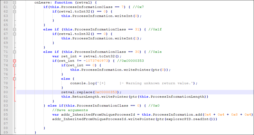 0x1E(ProcessDebugObjectHandle),在本例中,我们将检查返回值,如果成功,则将参数ProcessInformation替换为0x0。参数 ReturnLength 也将被替换(第 72 - 81 行)。