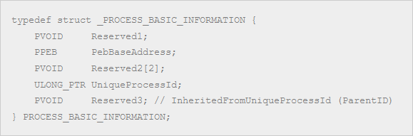 0x0 (ProcessBasicInformation),最后,如果选择了这个选项,我们应该知道 PROCESS_BASIC_INFORMATION 结构体将父进程的 PID (InheritedFromUniqueProcessId, offset 0x20) 替换为一个非可疑的 PID,例如进程 ‘explorer.exe’ 的 PID。