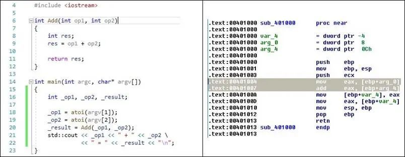 Frida是一个动态代码检测工具包。换句话说,它是一组允许代码插装的工具,提供给我们一些API,使我们能够在执行过程中拦截、分析和修改Windows、macOS、GNU/Linux、iOS、Android和QNX应用程序的部分代码。本质上,Frida允许在运行时对即将执行的操作进行操作。比如,当我们从一个简单的c++程序开始,该程序使用一个函数将两个值相加并返回结果。我们想要操作的函数声明为Add(int,int)。首先,我们将更改其中一个int参数,然后,更改返回的结果。编译完代码后,我们需要通过分析可执行代码来定位Add函数的偏移量。在本例中,我们使用IDA Pro来分析代码,但也可以使用允许我们分析可执行代码的任何其他方法或应用程序。我们在偏移量0x00401000处确定函数,并且我们知道可执行文件的基址是0x00400000,因此,函数的偏移量是0x00001000。