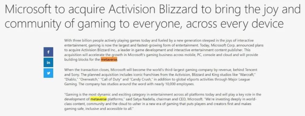 - 2022-01-25 微软687亿美元收购暴雪只为元宇宙