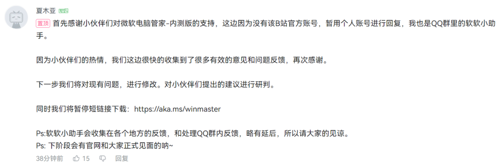 IT之家 1 月 25 日消息,今日上午,在有关微软电脑管家内测版的视频中,自称为“微软电脑管家官方”的人士表示,下一步微软电脑管家将对现有问题进行修改,并对用户提出的建议进行研判,同时将暂停短链接下载。