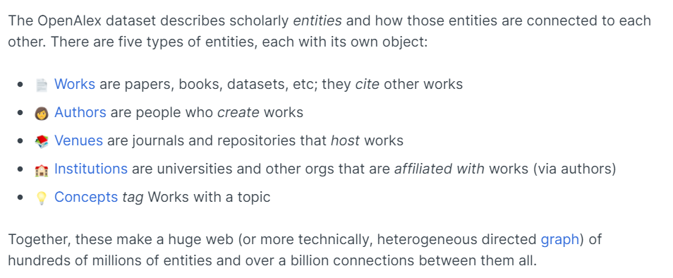 OpenAlex数据集描述了5类学术实体以及这些实际之间的联系。每类实体分别对应其目标: